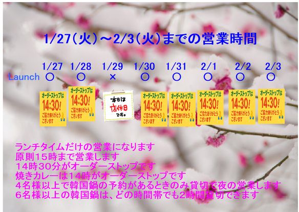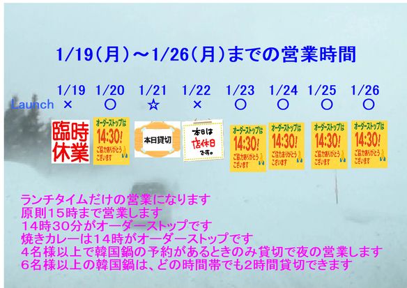 今週の予定です このくそ寒い時に 韓国鍋 豚キムチ鍋食べに来てください 6名様お集まりください どの時間帯でも2時間程度貸切できます 17時以降なら4名様でも貸切です